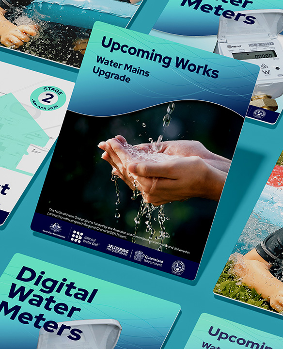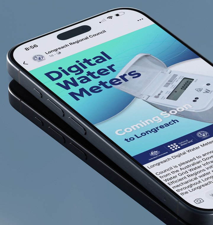 Working with Longreach Regional Council’s Marketing and Communications team, the Australian National Water Grid, the Queensland Government, and Taggle (the digital water meter supplier), we developed clear and accessible communications for a diverse regional audience. This process involved understanding the needs of Council, residents, and contractors, defining communication objectives, and crafting concise messaging. A cohesive design approach was applied across print, digital, and on-site materials to ensure consistency and clarity, while the rollout strategy was aligned with project milestones to maximise community engagement and trust.