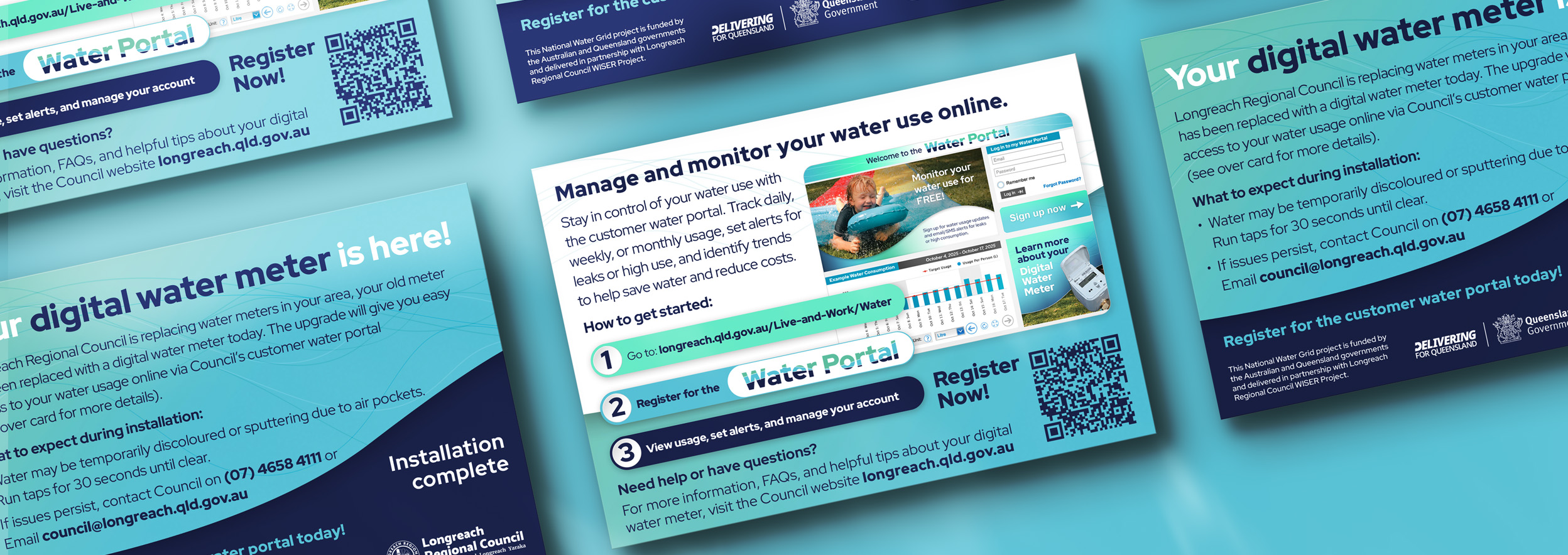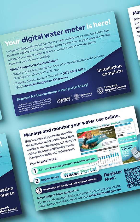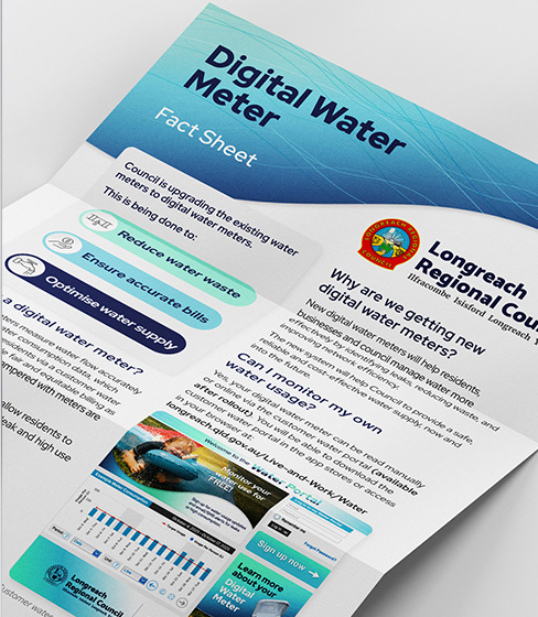 Erica Miller Design delivered a complete suite of communications for the Longreach Digital Water Meter Installation Project. This initiative, supported by funding from the Australian Government through the National Water Grid Water Infrastructure for Sustainable and Efficient Regions program, involved replacing ageing mechanical water meters with digital meters supplied by Taggle.